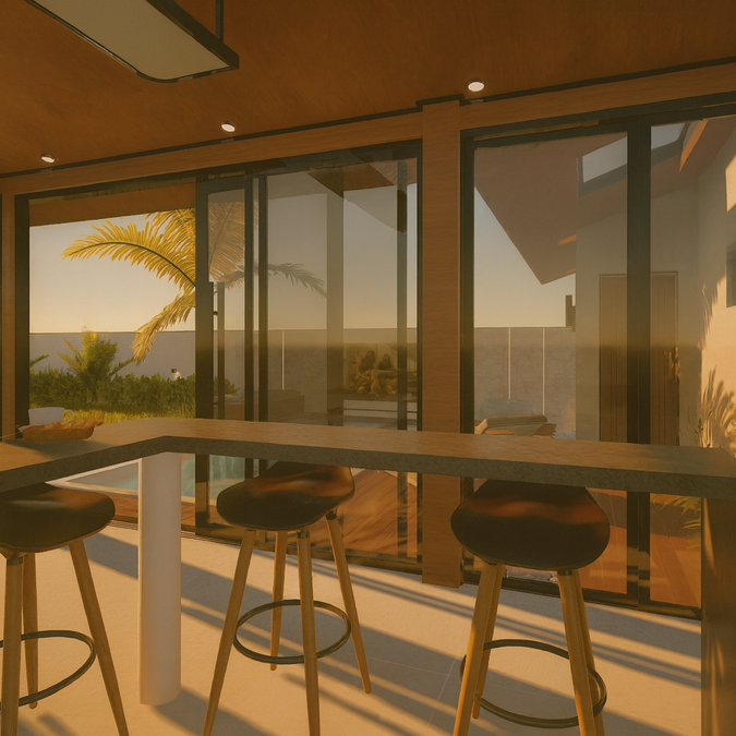 Entre o interno e o externo, tudo se conecta - o toque da madeira, a textura das paredes, a luz dourada refletindo na piscina. Cada detalhe foi pensado para criar um espaço de pausa, onde o tempo parece andar mais devagar. Com o projetor ligado à noite e o som da água ao fundo, até um final de semana se transforma em história.